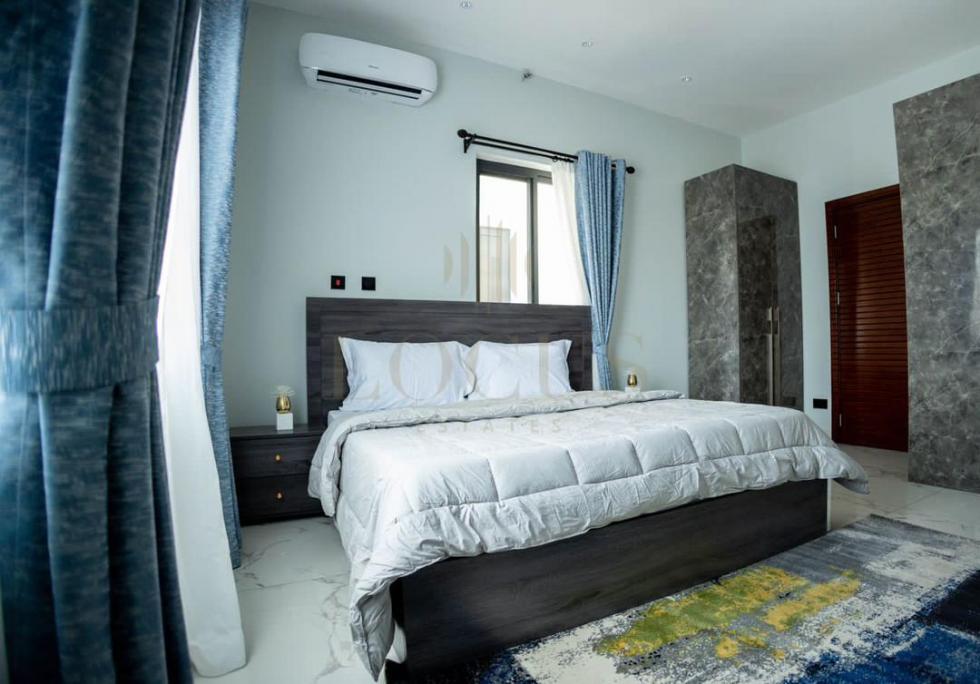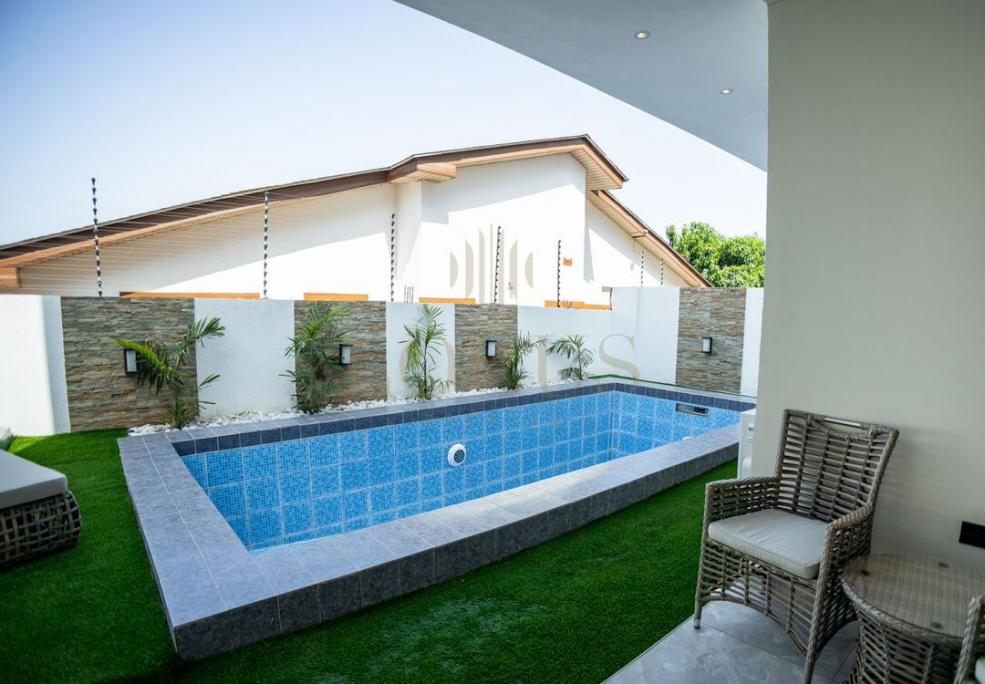 L.D 1A is a fully furnished 3-bedroom, 2-storey house at East Legon Hills. It comes with a living room, dining Lounge, kitchen, backyard for relaxation, a staff quarters, a covered balcony in the master bedroom area, a security bay with a washroom, a visitor's washroom on the ground floor and a swimming pool. Appliances in the house include a gas stove, microwave, oven, heat extractor, double sink, and a smart refrigerator. Selling Price - $280,000 Plot Size – 35 by 100