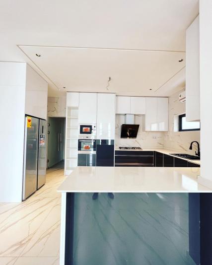 *Ultra-modern fitted kitchen set (soft touch .ie. Drawers does not bang) Which comes with a fixed electric and gas burner, 2 high-tech extractors ( Downdraft ) , Microwave and Oven.